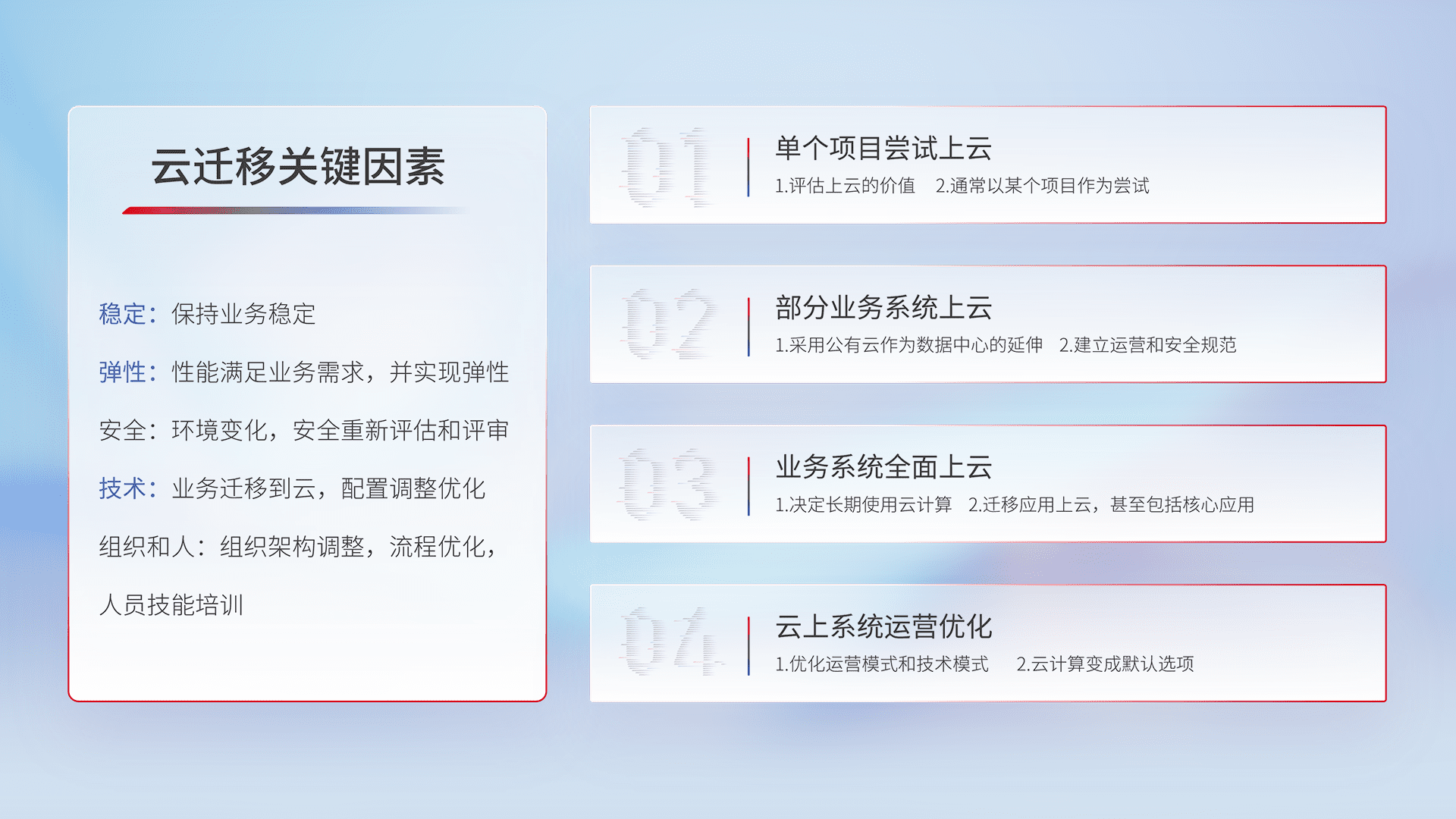 结合实际业务,,从规划设计、、、、云平台选型、、、、云原生改造、、数据迁移、、、、集成交付,,,迁移全过程为客户识别最佳上云路径,,做好风险识别管理,,,,设计网络架构、、、、身份权限、、、安全审计合规、、、操作审计、、、、日志审计、、、、监控告警策略、、、多站点容灾设计等,,对云上基础设施进行整体规划,,,,提升IT治理水平,,,以满足弹性、、、高可用、、高性能的需求。。。。